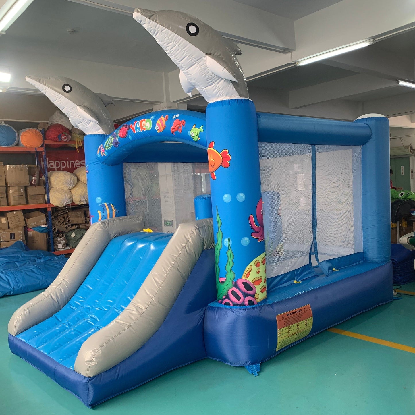 If you are looking for a fun and exciting way to entertain the little ones, our dolphin-themed bounce house is the perfect choice. Designed with a variety of marine life patterns and playful dolphins, this inflatable house will bring joy and laughter to any party or event. Built-in basketball hoop for little ones to practice shooting and slam dunk, it encourages kids to race together. It is not just a fun activity, but also a great way to promote physical activity and coordination. Kids will love the feeling of jumping and bouncing around in a safe and supervised environment, while parents can rest assured that their children are having fun and staying active.